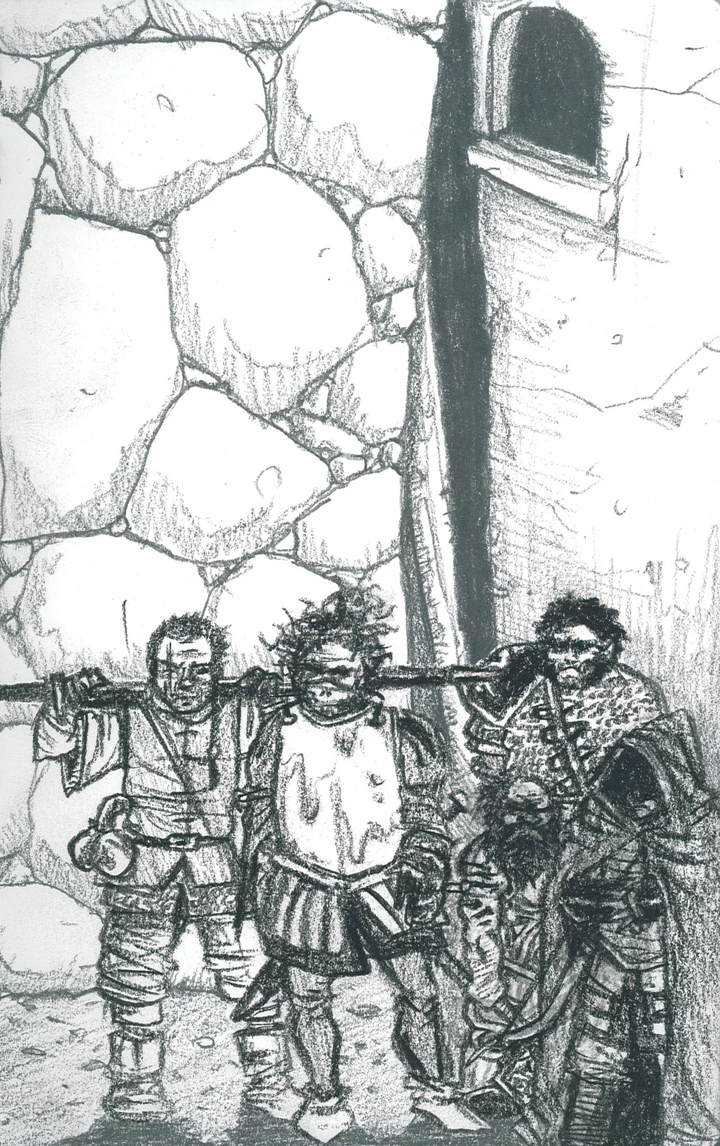 I know I said the next post would be more of the older existing DB artwork displayed in event order, but I just finished off this quick Charcoal and pencil DB’s portrait that I started scibbling a few weeks ago.  I thought I should post it up as it is much more current than the party portrait I posted up earlier and left in the “who are the Dangerous Boys” page.  It shows (from left to right) Billy, Garibaldi, Grim, Garouk (behind) and Flint.  I know it looks like Grim, Garouk and Flint have been relegated a bit with Billy and Garibaldi taking centre stage, but In my defence it was an accident.  I didn’t really think much about the composition before I started drawing and after I had done Gari and Billy I realised there wasn’t much room left on the page for the others.  I’ll try and make it more even next time.