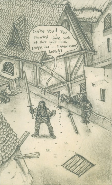 This illustration (above) is the last one for this post and is once again from the third adventure. It captures the Historic moment when Billy declared to all of Lankmhire at full volume that we were “The dangerous boys”. This proclamation was bourne of frustration when Billy (followed slowly and ungracefully by Garouk) burst onto a rooftop only to discover the Gnome Supervillians trail had gone cold. Billy Roared across the rooftops that “you will never escape the…..Dangerous Boys”. Inspiringly Billy’s player had actually leaped to his feet in real life and drunkenly roared the same thing. After the laughter subsided it was apparent that this label was too fiercely lame to ignore and the party became The Dangerous Boys.