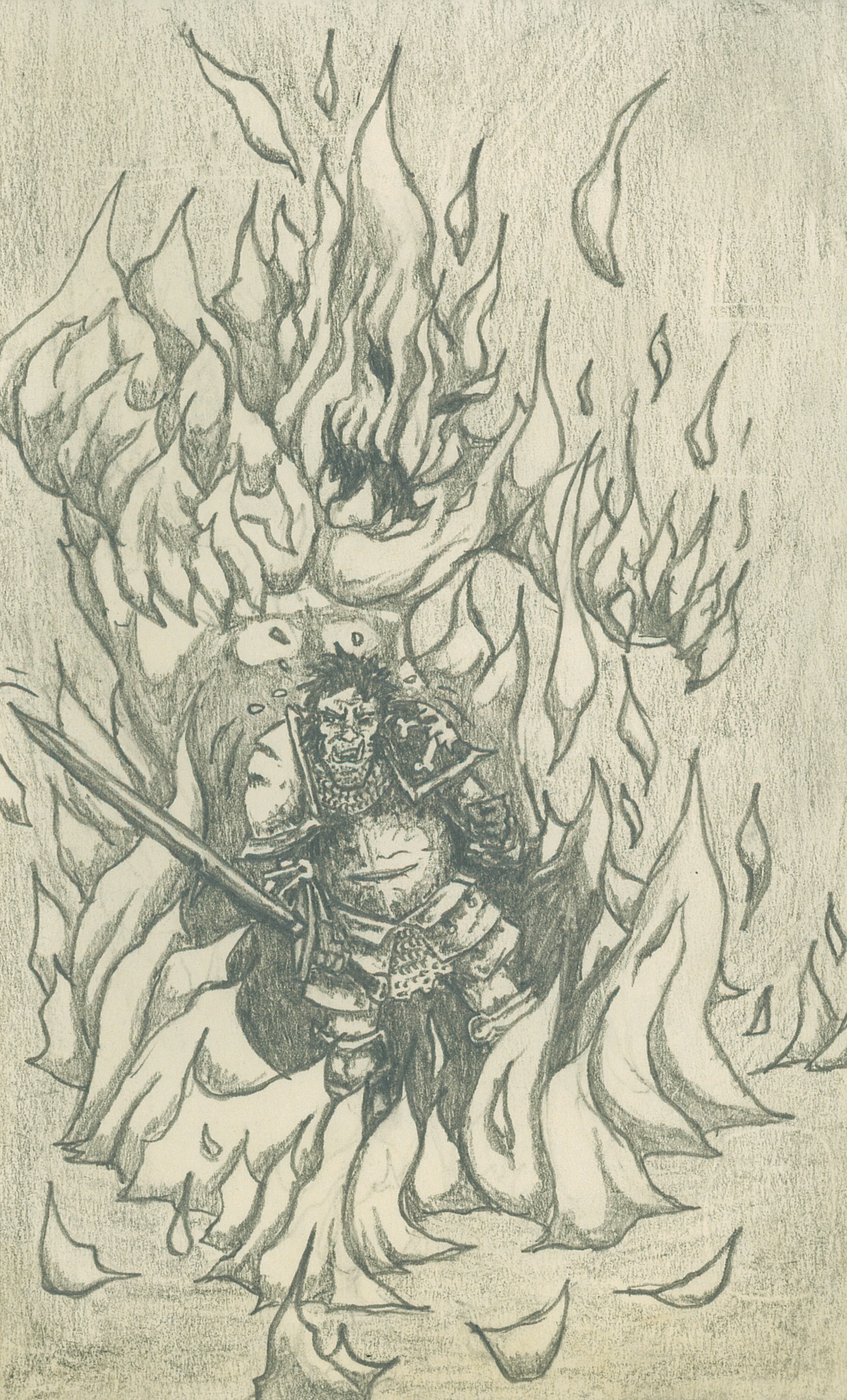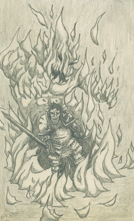 This illustration (above) is from later on in the third adventure. Having entered the Drugar tunnels and slaughtering some Emaciated Dark elves who had set up shop there (An Image I will try and produce in the future as it was an exciting combat which climaxed in some of the dark Elves being scalped) we proceded through the Dark Elf Sewer tunnels (during which Grim had to consent to be “tossed” over some gaps lest he swim through Dark Elf refuse), find the scrolls and eventually Bump into another party of adventurers who for the most part mirrored our party (they were the Bizarro DB’s). Their magic user quickly cast hold person on Garouk before summoning a Fire elemental to slowly feast on him while he was paralised. Garouk spent the remainder of the encounter in this state and somehow managed (mostly through bad Rolls from the DM) to stay alive. I can’t remember who wasted the magic user and dispelled the Elemental in the end but it certainly wasn’t “Mr easy target” .