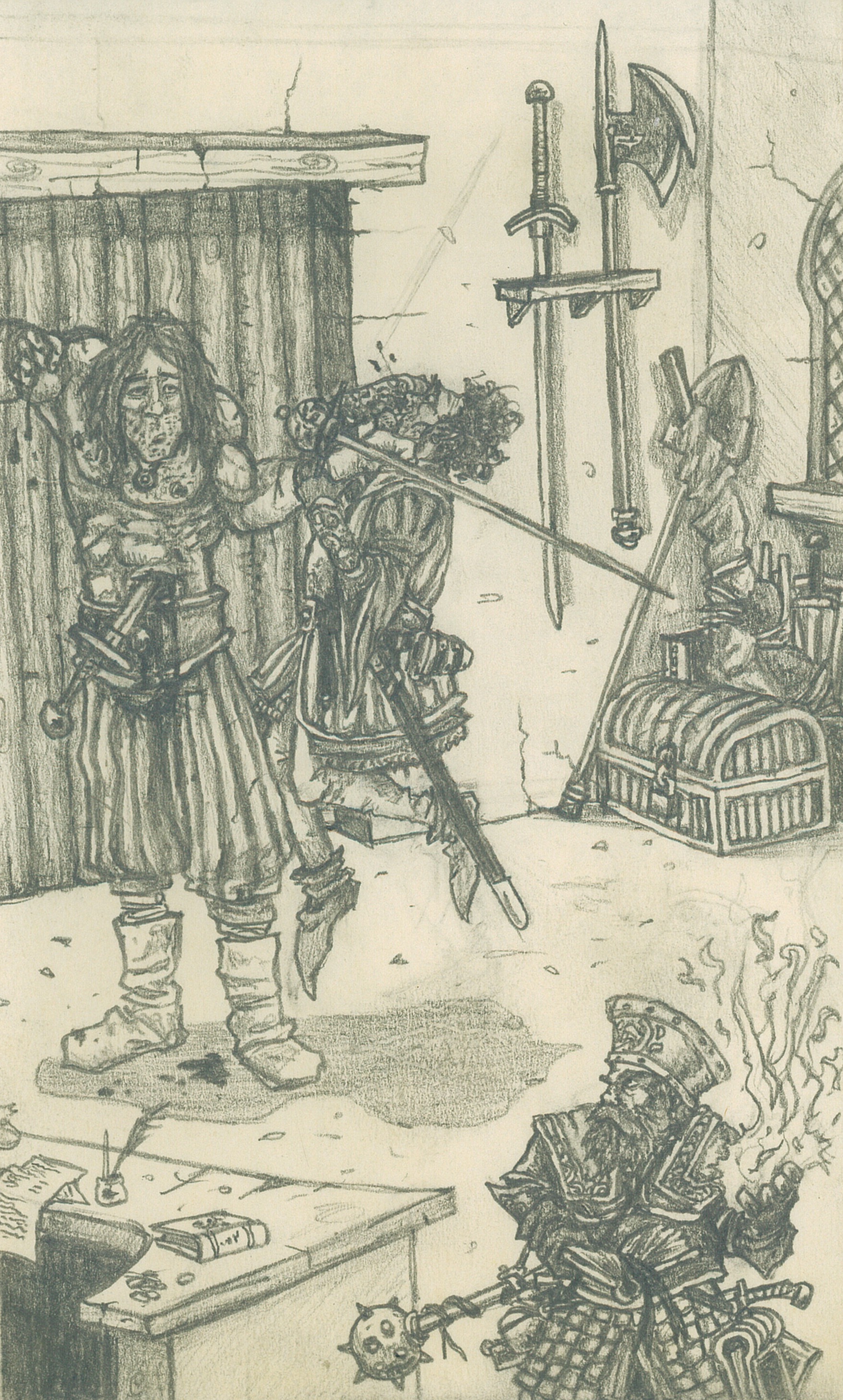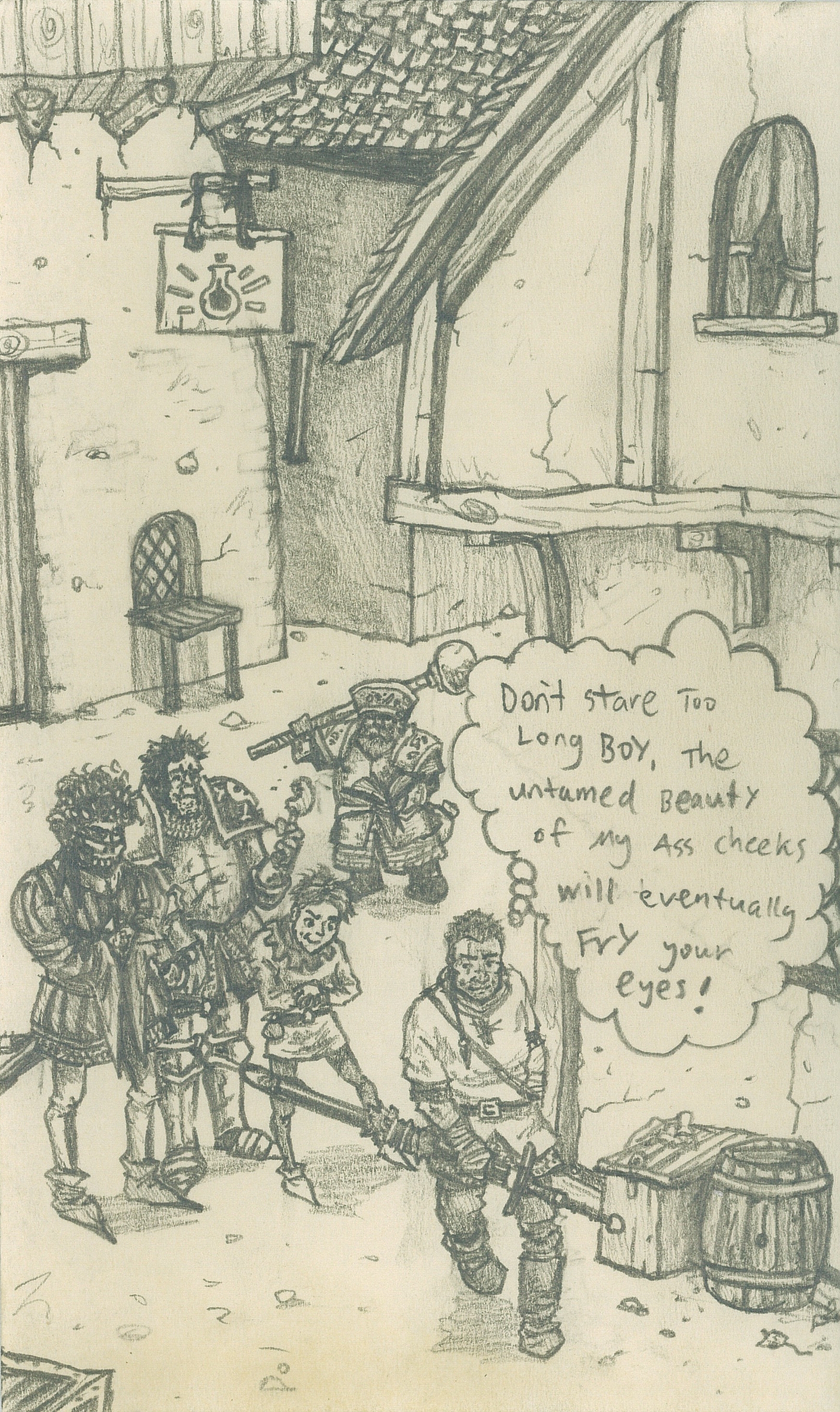 This illustration (above) I seem to recall is from our third adventure. I believe the DB’s were hired anonymously (through several layers of ill-informed henchmen) to track down some ancient scrolls in an old abandonned Drugar stronghold in the mountains. Before leaving the city on this mission some of the boys decided to try and gather some intel on the mysterious guy we were now working for. In his fierce (an ultimately fruitless) hunt for leads Billy started interrogating some random stable boy. This young lad swooned at the attention and began to pepper Billy with an avalanche of bold amorous advances. A normaly composed and decisive Billy was taken completely by surprise and after a few flustered and indecisive spluterings Billy turned tail and strode off in a huff, only to feel the fire of the Lads passionate gaze burn yearningly into his ass checks coupled with the keen sting of his commrades taughts as he disappeared down the street.