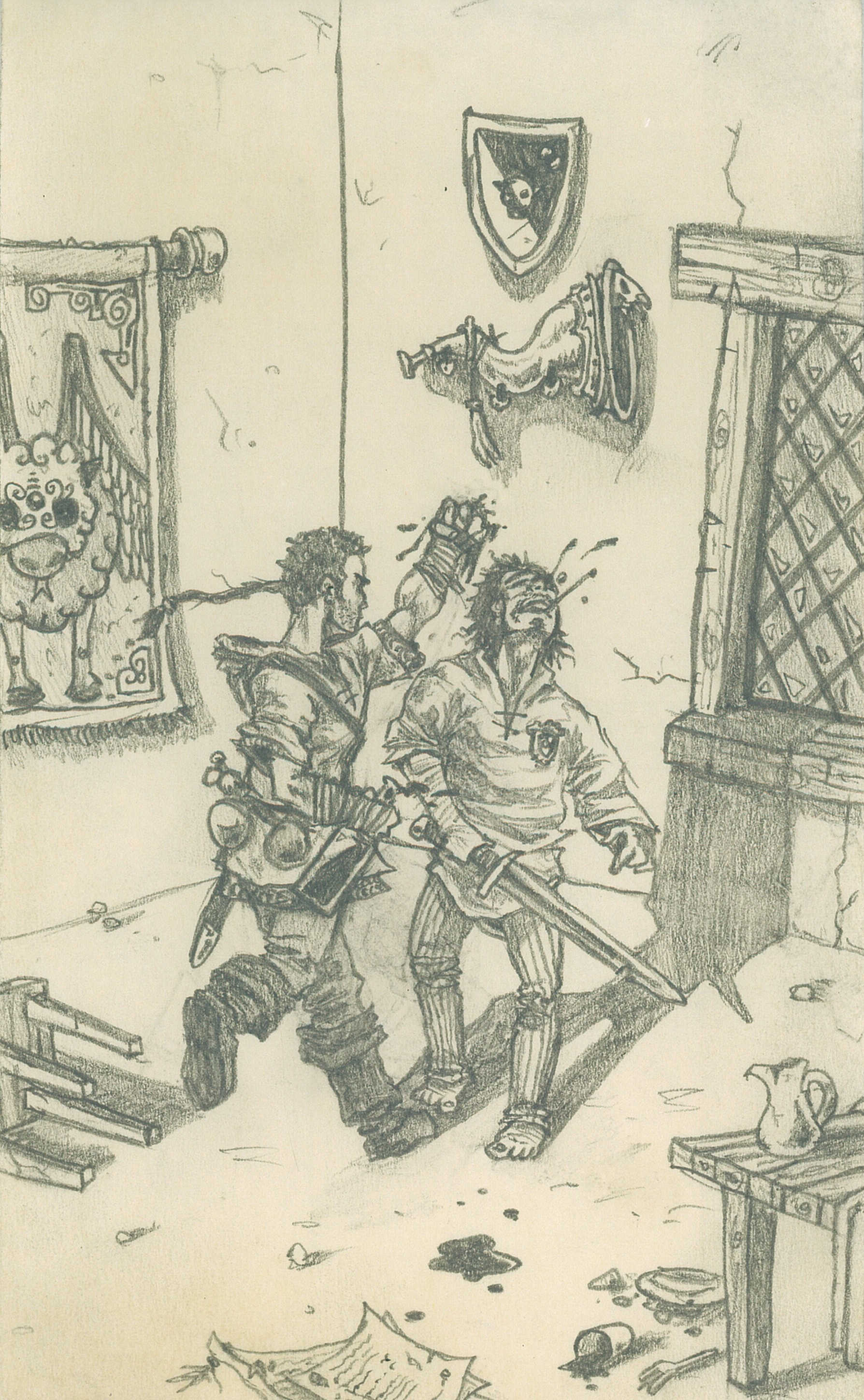 I’m pretty sure this happened during our second adventure (unfortunately I didn’t start doing these “historic moments” till after the second adventure), it captures Billy drunkenly bursting into a country manor house and entering “negotiations” with the guards. As I remember it the boys had just finished slaughtering a cell of Wererats in a nearby farm, who had been robing merchants (the DB’s were hired to put an end to the robberies) and were on the way home when they stopped at a local village pub to celebrate. Billy was approached by a young lady with a dramatic sob story about suffering great injustices and being dispossessed by the lord of the manor. The already “roaring” drunk Billy fell in love and gathered up the rest of the boys to go and restore the ladys honor. Garibaldi (also “Roaring” drunk) hatched a cunning plan to gain access to the Manor house by posing as Government sanctioned Drop-Rat inspectors who were doing terribly important Midnight infestation checks in the interest of public safety. This was agreed upon and Gari attempted to invent some kind of official looking disguise using whatever was handy. The plan spectacularly failed and Billy swiftly initiated plan B, which of course was charge in, kill everybody in sight, break everything and find the pub girls necklace.