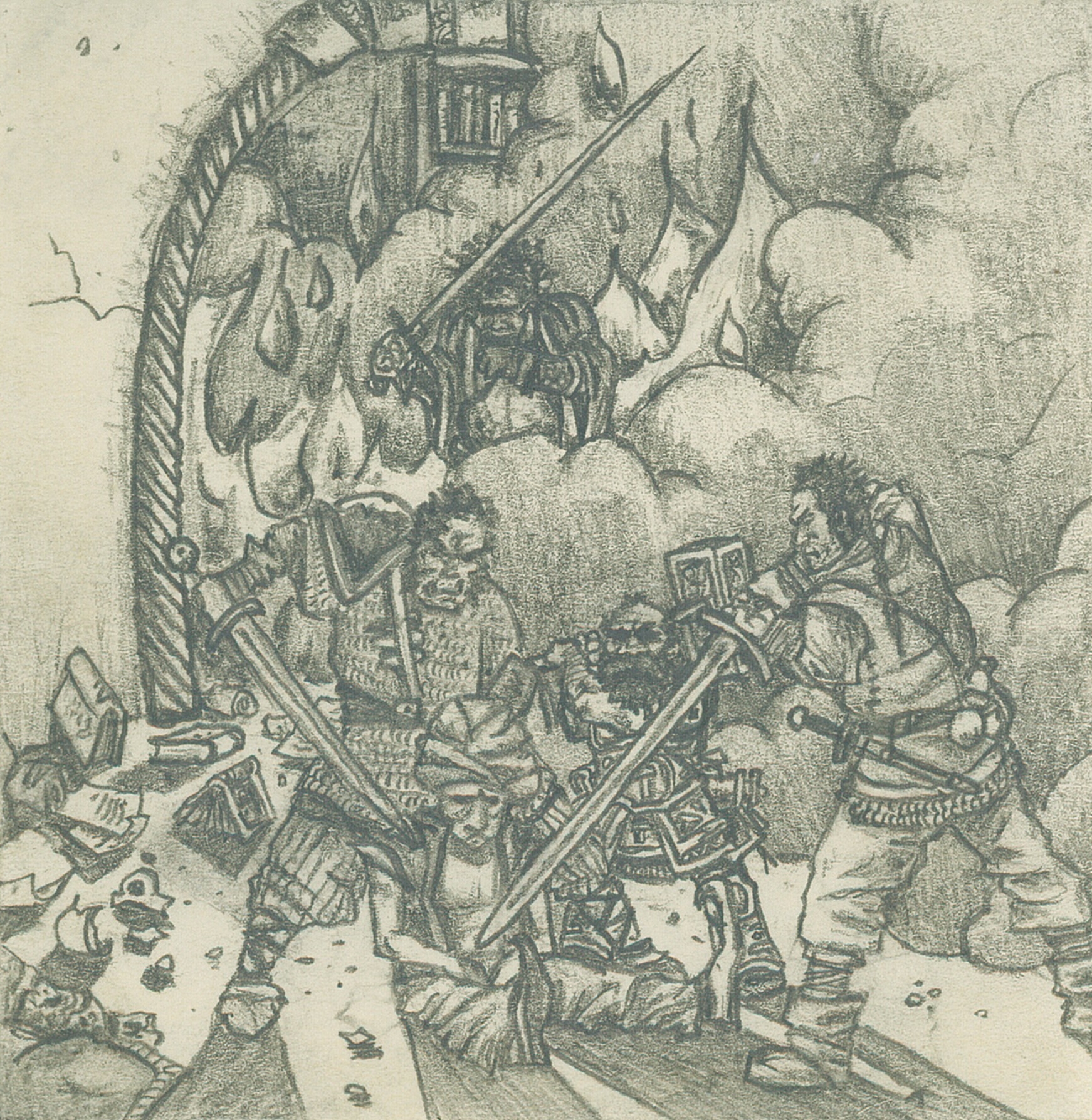 This last scene is taken from the same adventure as the previous image.  It illustrates the moment the DB’s finally managed to capture a formidable Genie nerd in his fancy magical library fortress in the clouds.  Things had been progressing unfavourably since the Blue Boar had been burnt to the ground.  However there had been a recent breakthrough when the boys had been informed by a disgruntled employee of the Gnome super villain that he was controlling countless citizens with the aid of some freakishly powerful Genie enchanted magic acid (I have a reasonably strong recollection of the Gnomes henchman throwing enchanted acid into the faces of people he wished to control).  I seem to remember that his grand scheme was to take control of the merchant council and effectively put a strangle hold over the whole city.  This time the DB’s were fighting not just for their own selfish and obscure reasons but also for the fate of the city itself and the situation seemed Dire with far too many of the Gnomes puppets around for even the DB’s to hack their way through.  The unhappy employee suggested that the best course of action was to capture the Genie behind the magic and have him break the curse to even the odds a bit.  luckily this employee was a wizard who could transport the DB’s to the Genies Library in the clouds, of course we had to do him a solid too, something about his imprisoned sister or wife or something.  Anyway the boys were beamed up to the Magical realm were they carefully snuck into the fortress library like an awesome D&D SWAT team.  Once inside Garouk crept ahead into the Genies vast library were he was quietly studying and went for the backstab.  This attack proved a little less effective than we thought and the Genie transformed into a magic fueled Cyclone and began to toss the BD’s around like rag dolls.  Garibaldi thinking he had just had one of the greatest ideas in adventuring history rushed into the library and began threatening to burn the library to the ground if the Genie didn’t surrender.  The genie became considerably less cooperative, Garibaldi lit up the priceless books and the Genie became even more enraged.  I can’t quite remember the finer details of what unfolded next (I was substantially drunk by then) but essentially the boys continued with plan B until the Genie had been hacked and bludgeoned into submission.  when Garibaldi finally managed to stumble half conscious from the library inferno (where he had unfortunately trapped himself) the Genie was in custody, we used the three wishes he granted us to break the enchantment on the Gnomes henchman, do whatever we were supposed to for the wizard and something else I can’t remember.  after returning triumphantly  to Lankmire things fell more or less into place. After breaking into the Gnomes mansion through the sewers, and tearing our way inch by blood soaked inch through his house killing everyone who stood against us (including some of Garibaldis’ old comrades from his past as an elite house hold) we finally cornered our foe and put him to the sword, Billy’s sword I think. The City was saved and the DB’s increasing fame was set to grow even more.