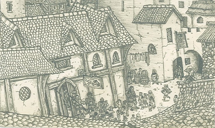 This next illustration is from the Adventure after the Dragon organ collection job, the same adventure in which Garouks Beard fantasy came true.  This Scene captures an early moment in the adventure when the DB’s took to the underwhelming beer garden out the front of the Blue Boar to enact a daring plan of ruthless defamation against a wealthy buisiness man who had threatened them, a buisiness man they believed to be the Gnome super villian from their past.  I can’t remember what the threat was now, but the DB’s response was swift and involved Grim and Garouk paying vast numbers of street urchins to spread vicious rumours about their foe while Billy and Garibaldi got drunk and disgussed amendments to the plan that never quite evolved from the planning stage.  These rumours mostly involved the blatant suggestion that this Gnome was in reality a disgusting pervert with a disturbing preference for young boys.  I seem to remember Garouk and Grim adding further fuel to this savage and Hilarious attack by spreading another simultaneous rumour that any young urchin boy who goes to this Gnomes mansion can expect to be richly rewarded for their trouble.  This of course saw scores of young boys turn up to the Gates of the Gnomes mansion giving the lankmhire pulpulation more reason to be suspicious and perhaps begin to take these rumors to be the truth.  I believe we also payed Urchins to hurl shit and rotten eggs at the Gnomes mansion and payed another set of urchins to paint pro BD slogans around town declaring essentially that the Gome was “Going Down” in various creatively violent ways.  It was a masterful multi-layered attack which unfortunately quickly lead to the merciless torching of the Blue Boar.  This was a traumatic event which not only left the DB’s temporarily homeles but nearly claimed the life of Billy who burst into the flaming Inn to try and save his meager belongings.  Incidentally he did manage to save some of his things and xplode out of the second story window in a daze of lung ravaging smoke inhilation.  It was soon after this that the DB’s found themselves in an alley wearing fake beards.