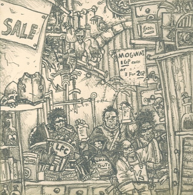 This first image is an impression of the possible appearance of Honest Kroddes Emporium at a time when the DB’s would be patronising it. The existance of Kroddes Emporium (Or “Kroddes joint” in the Dangerous Boys vernacular) was a little hint of information about the upcoming adventure that the DM gave us as a little teaser. we were told that at some point in the looming adventure we would get to do some shopping at this establishment (which apparently stocks everything that officially exists in the D&D world) and we could order any magic item we liked as long as it officially existed somewhere in the game literature and we could afford it (Krodde priced his stock according to the recommended retail price). A torrent of carefully considered orders gushed at the DM and ranged from bastard swords that emitted no light all the way up the scale of awesome to an enchanted acid coated breastplate of awesomeness (this would be intended to deliver life threatening hugs and so forth). There was also much discussion on what manner of shop keeper Krodde would turn out to be and how his emporium would be presented. The comparisons with the shop form Gremlins where the 8o’s guy buys the Mogwais’ soon dominated the discussions as did a growing expectation that Krodde would also be stocking Mogwais’ and Mogwai related products. the above illustration is the result of all these Krodde related hypothesese. Of course when the time came to meet the famous man and buy shit from him he was nothing like the Gremlins shop keeper nor did his premisis resemble the hoplessly cluttered appearance of the Gremlins shop