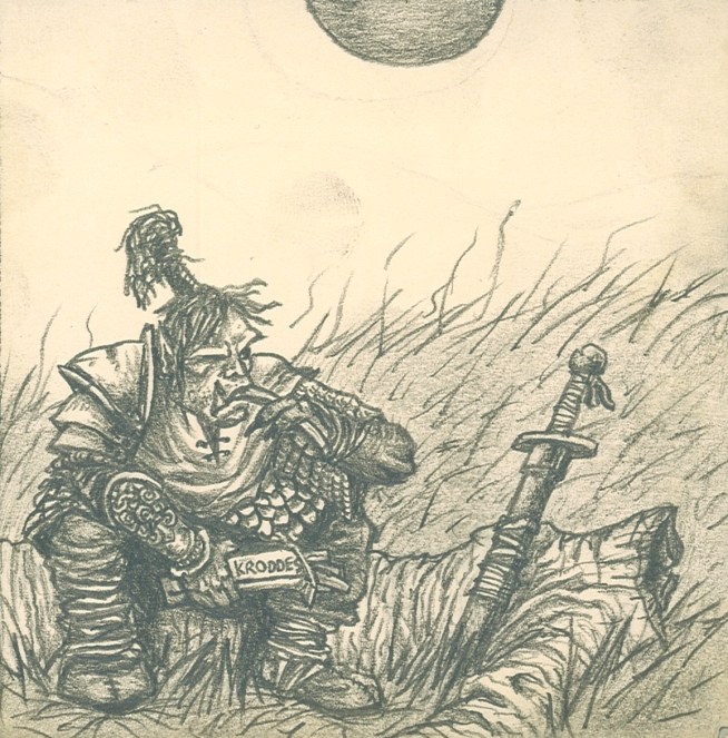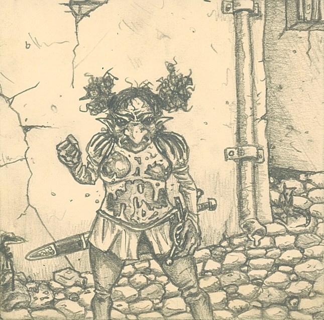 This image was born from further discussion on the hypothetical topic of “Krodde” brand Mogwai products. It showcases the delicious and both highly portable and satisfyingly nutritious “Mogwai Jerky” snack pouch. This was a hypothetical adventuring snack product that we began to expect would not only spontaneously begin to exist in the D&D universe but would also be available in handy ‘Krodde” brand pre-packaged portions at Kroddes. Several orders for Mogwai jerky (of various flavours) were also placed with the DM. This “tough as weathered elbow skin” adventurer that is demonstrating the Mogwai Jerky is nobody in particular, just some cynical Orc fighter with a moderate case of PTSD and a colorful history. I felt like a break from drawing the DB’s.