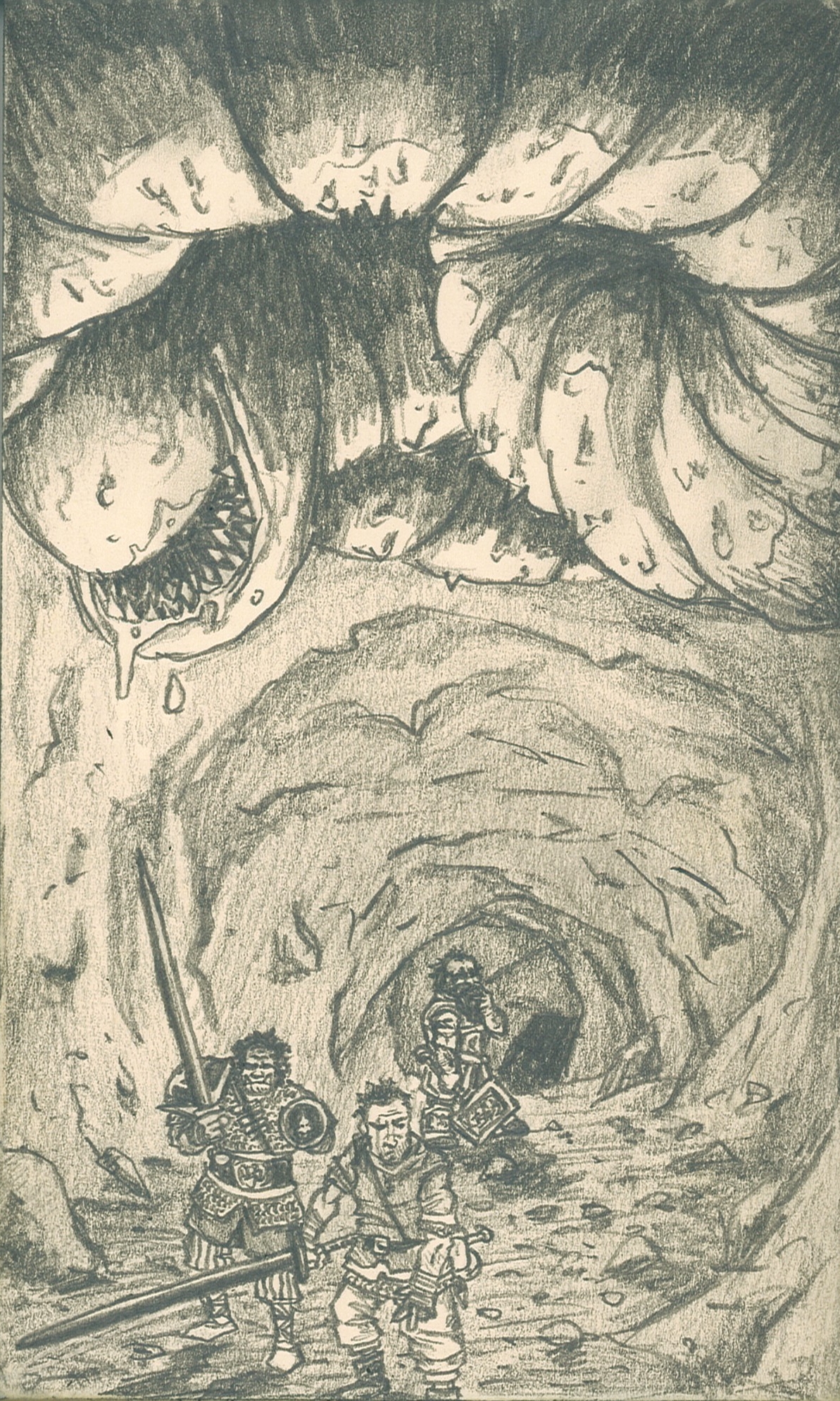 This drawing is not based around aticipation for the SNOMAR adventure as the previous ones were. this one was drawn as a prediction for what may have lay ahead for the boys in the adventure following the SNOMAR adventure. Unfortunately I was unable to attend this adventure, but I was still privy to the emails that circulated prior to it’s manifestation. One of the last communications before this adventure went underway was the DM revealing the title of this adventure, “the heart of the Wyrm”. Naturally after hearing this adventure title I assumed that the DB’s who were going into the breach would be facing off against some type of unspeakably evil worm like creature. Something that lived deep in the depths of an unforgiving subterrainean labyrinth soaked in terror and dripping with sudden death. I elaborated in my minds eye that they may infact be hired to snatch the ‘Heart” of this wyrm from its terrifying body or perhaps be journeying into the “heart” of the Wyrms lair to steel/recover/destroy or even deposit something. either way I saw little in the DB’s future other than razor faced Giant Wyrms, Garouk eating chicken, Billy blowing all his money from the last adventure on booze and dice and Grim casting a lot of healing spells. Hence the picture of impending Wyrm elated violence in an ambush prone underground tunnell.