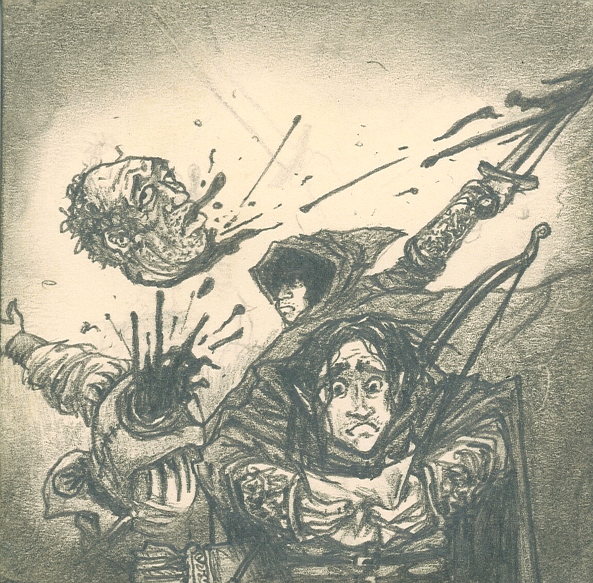 This represents Flints remorse after reading the Lankmire times over breakfast only to discover that the man he had decapitated rashly the night before was, in fact one of the cities greatest loved philanthropists.  Flint had been on a solo mission of self discovery when he came across a street urchin trying to escape this man.  Flints flashbacks from his tortured youth as an orphan overcame him and he dispatched the man without warning.  This man turned out to be a benevolent foster father to orphans from all over lankmire known for giving street kid a leg up and a chance at a better future.  He was trying to rescue the urchin from the mean streets.  Of course self control, restraint and prudence are not really strong Dangerous Boy attributes.